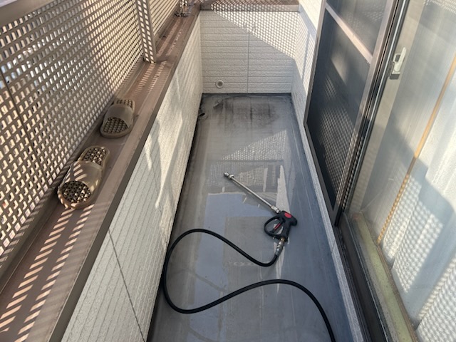 高圧洗浄機を使用してベランダの土間(床)の汚れやカビ、コケを洗い流します。